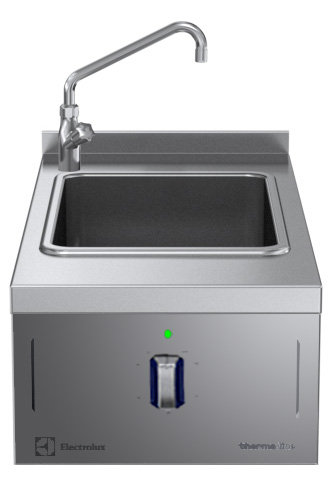 Unit constructed according to DIN 18860_2 with 20 mm drop nose top. Internal frame for heavy duty sturdiness in 2 mm and 3 mm in 1.4301 (AISI 304). 2 mm top in 1.4301 (AISI 304). Flat surface construction, easily cleanable. THERMODUL connection system enables seamless worktop when units are connected and avoids soil penetrating. Water basin in 1.4435 (AISI 316L) stainless steel, seamlessly welded into the top of the appliance. Water temperature regulated by sensors. Safety systems and automatic low-water level shut-off protect against overheating. All-round basin raised edges to protect against soil infiltration. Metal knobs with embedded hygienic silicon 'soft' grip enable easier handling and cleaning. IPX5 water resistance certification.Configuration: One side operated top with backsplash and rear mixing tap.
