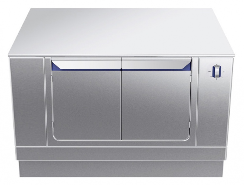 Configuration: One side operated freestanding base, hygienic class H2.1000 mm wide warming cabinet with 2 doors, constructed according to DIN 18860_2 with 70 mm recessed plinth. Internal frame for heavy duty sturdiness in 2 mm and 3 mm in 1.4301 (AISI 304). 2 mm top in 1.4301 (AISI 304). Flat surface construction, easily cleanable. THERMODUL connection system enables seamless worktop when units are connected and avoids soil penetrating. Temperature in the cabinet can be set through thermostat, up to a maximum of 110 °C. Cabinet storage space accepts GN 1/1 containers.