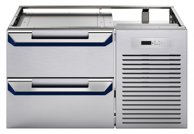 Ref-Freezer Base with 2 drawers, one side operated - R290. Handles are ergonomically designed with silicon "soft" grip for easy handling and cleaning. Designed for modular installation into the cooking block.