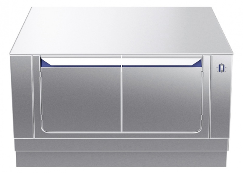 1000 mm wide warming cabinet with 2 doors, constructed according to DIN 18860_2 with 70 mm recessed plinth. Internal frame for heavy duty sturdiness in 2 mm and 3 mm in 1.4301 (AISI 304). 2 mm top in 1.4301 (AISI 304). Flat surface construction, easily cleanable. THERMODUL connection system enables seamless worktop when units are connected and avoids soil penetrating. Temperature in the cabinet can be set through thermostat, up to a maximum of 110 °C. Cabinet storage space accepts GN 1/1 containers.IPX5 water resistant certification. Configuration: One-side operated freestanding base, hygienic class H2.