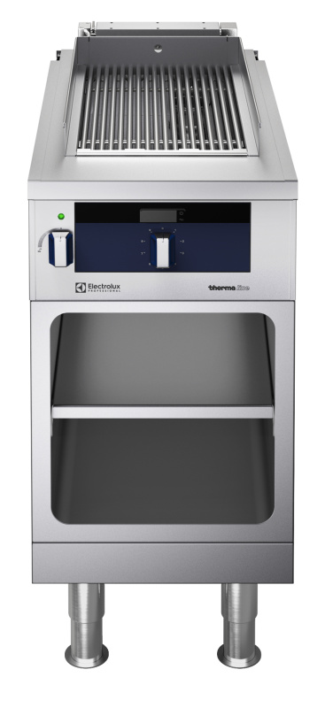 Electric Chargrill on base, H3, one-side operated - Marine. Stainless steel high splash guards on the rear and sides of cooking surface. IPx4 water protection. All major components may be easily accessed from the front. 2 mm top in 1.4301 (AISI 304). Unit constructed according to DIN 18860_2 with 20 mm drop nose top and 70 mm recessed plinth. THERMODUL connection system creates a seamless work top when units are connected to each other thus avoiding soil penetrating vital components and facilitating the removal of units in case of replacement or service. Flat surface construction with minimal hidden areas to easily clean all surfaces Metal knobs with embedded hygienic "soft-touch" grip for easier handling and cleaning. The special design of the controls prevents infiltration of liquids or soil into vital components. Internal frame for heavy duty sturdiness in 1.4301 (AISI 304). Burners are protected by 1.4509 (AISI 441) stainless steel deflective trays avoiding flare-ups and providing even heat distribution. Full-length grease collection drawer with filling indicator, to collect residual cooking grease, and handle to facilitate manipulations. Unit constructed according to DIN 18860_2 with 20 mm drop nose top.