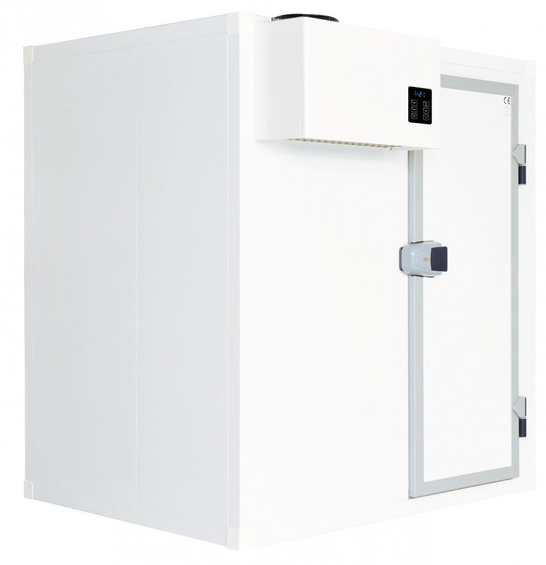 Cold Room 2030x1630 th.60mm, included Unit. Very short assembly time. Expert refrigeration knowledge is not required for installation. Anti-slip walk-in floor. High hygiene standards and easy to clean thanks to rounded internal / external corners and radiused edges. Fast-fit centering system allows perfect alignment of the panels. These new fasteners are made of high resistant composite materials and guarantee perfect grip/sealing of all components. Conform to ruling European safety and hygiene standards and CE marked. Equipped with internal lighting (waterproof IP54) mounted on the refrigerating unit panel. Floor surface on which the cold room will be placed should be levelled if presenting irregularities or unevenness up to 1 cm. New vacuum injection foaming allows significant and enhanced insulation and higher quality. Airtight panels connection, all sides of panels have PVC gasket foamed in place to assure airtight and secure fitting; any other sealing between panels on site is eliminated. Panels are cladded inside and outside with anti-scratch galvanized plastified steel with 120 micron nontoxic pvc coating, polyurethane foam insulation, CFC and HCFC free. Defrosting through heated gas with re-evaporation of defrosting water permits to reduce the total power installed, shorten defrosting time and limit the warming of the cold room. Dedicated drain hole is not needed. Newly designed handle complete with lock and interior safety release to prevent entrapment when the door is accidentally locked from outside.