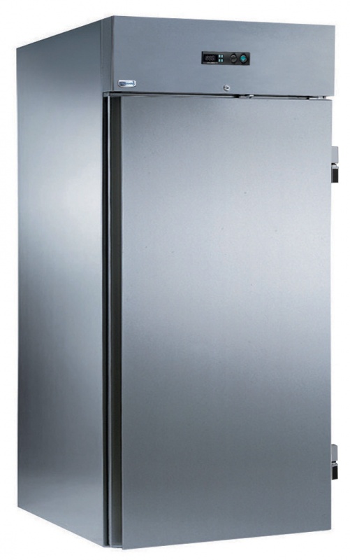 External and internal in AISI 304 stainless steel. Insulation thickness mm75. Reversible right hinged full door with lock, 60mm thick insulation. Bottom door gasket adjustable. Universal shock protectors on all sides. Remote refrigeration unit; ventilated operating mode. Digital control panel; temperature display; humidity control; hidden evaporator; automatic defrost and automatic evaporation of defrost water. Evaporator probe optimizes defrost cycle. Operating temperature +2/+10°C at 43°C ambient temperature. CFC and HCFC free insulation. R134a gas in refrigeration circuit. Gas in foam: Cyclopentane. Compatible with trolleys (mm820x1015x1840h).
