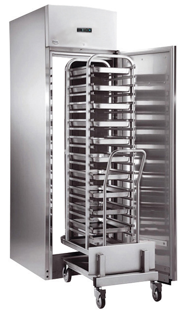 External and internal in AISI 304 stainless steel. Insulation thickness mm60. One right hinged full door and one glass door with lock. Bottom door gasket adjustable. Built-in refrigeration unit; ventilated operating mode; digital control; evaporator; automatic defrost; external digital temperature display; high/low humidity switch; internal lighting. Operating temperature +2+10°C. For ambient temperatures up to 32 °C. CFC and HCFC free. R134a gas in refrigeration circuit. Gas in foam: Cyclopentane.