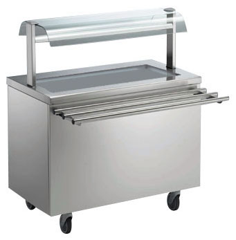 304 AISI stainless steel worktop with rounded edges. Refrigerated static dole plate (30mm deep) with rounded corners, thermostatically controlled temperature can be set between -10/+10°C, in 304 AISI stainless steel with drainage tap. Tempered glass overshelf with cold lights. Side panels in stainless steel. Ambient cupboard with stainless steel doors on operator side. Tray slide in stainless steel tubing, mounted on the customer side of the unit, folds down in order to facilitate passage of the unit through doorways. The unit is mounted on 4 wheels (150mm high).
