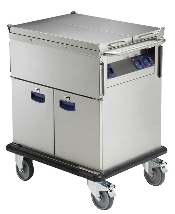 Structure in (40x40mm) squared tube, panels, top, well and integrated lower shelf in 304 AISI stainless steel. 4 swivelling antitrack wheels 125mm diam., two with brakes. 4 integrated bumpers. Ergonomic handle on the top of the trolley. Coiled electric cable with safety locking antibreak. Well accepts GN containers 200mm depth. Heating via etched-foil type elements positioned under the well (low power dispersion). Temperature of well regulated from 30° to 90°C and 1/2' drainage with opening valve. Maximum temperature of external panels less than 50°C. Control panel with 2 indicator lamps for power and heating element activity. Top with 2 hinged lids. Lower compartment with double walled doors, insulated panels and tube handle in stainless steel. Heating of lower compartment with elements placed underneath the lower shelf. Lower compartment with removable runners accepts GN 1/1 containers. IPX5 water resistant.
