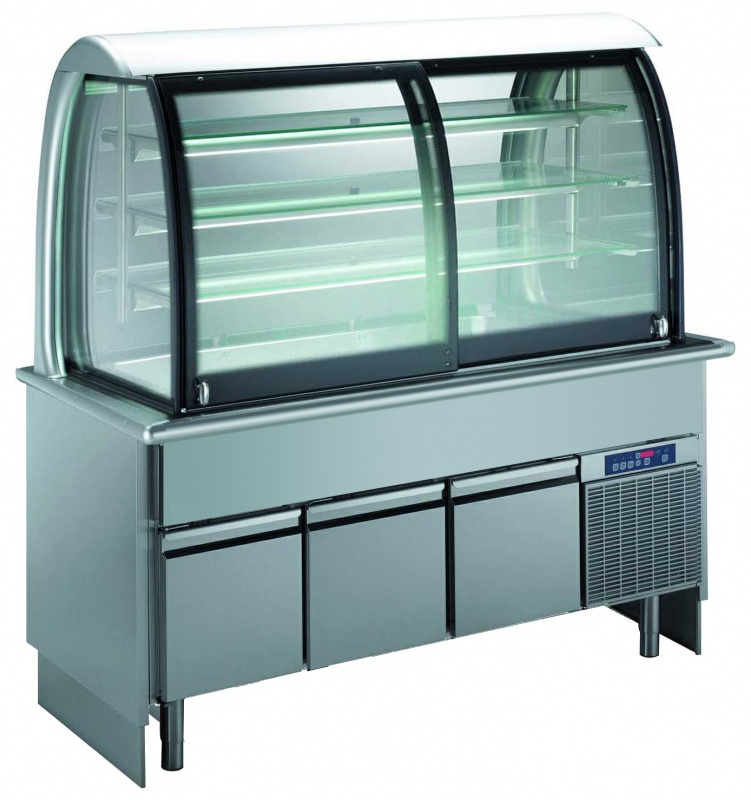 20/10 top, external panelling, base and feet in 304 AISI stainless steel. Insulated construction with high-density expanded polyurethane foam, 50mm in thickness. R134a gas in refrigeration circuit. Gas in foam: Cyclopentane. CFC and HCFC free. 2' round feet, adjustable, 200mm in height.OVER THE TOP: Refrigerated Display Unit (+2+8°C) - mm1668x700x900h - open on customer's side with curtains included. Sliding and removable glass doors on operator's side. N.. 3 shelves in tempered glass, each one fitted with light.The ColTEMP System (Air Flow) guarantees an uniform cold temperature all over the well and the display unit.TOP: Refrigerated Well (+2+10°C) - mm1280x510x150h - can accommodate n. 4x1/1GN (not included). Completely welded, in 304 AISI stainless steel with rounded corners. LOWER COMPARTMENT: Refrigerated Cupboard (+2+8°C) - mm1160x620x360h - with n. 3 hinged doors. Fan assisted refrigeration. It can be equipped with frames to hold 1/1GN grids and trays.Display Unit/Well and cupboard are separately controlled. Automatic defrost.SMART control panel equipped with easy-to-read buttons (ON/OFF, Alarm Service, HACCP button to monitor and record all the critical events, 2 buttons to increase and decrease the temperature, temperature display and thermostat and manual defrost button. FIVE temperature PROBES are controlled by the electronic panel; even if one of these probes is broken the optimal conservation temperature is maintained) that cannot be accidentally knocked.