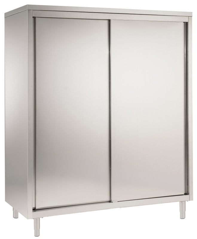 Constructed in stainless steel. Intermediate shelves, supports and inner doors in stainless steel. Handles are formed by a fold in the sliding doors. Adjustable feet.