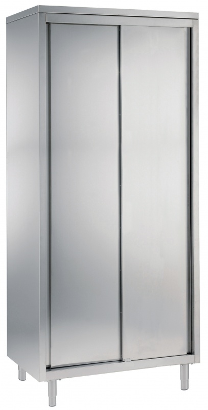 Constructed in stainless steel. Intermediate shelves, supports and inner doors in stainless steel. Handles are formed by a fold in the sliding doors. Adjustable feet.