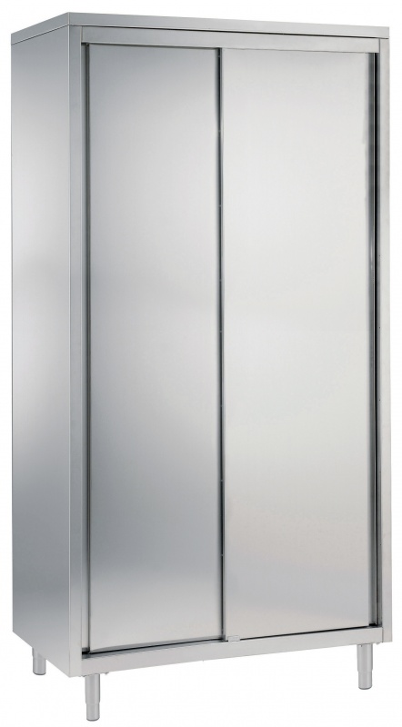 Constructed in stainless steel. Intermediate shelves, supports and inner doors in stainless steel. Handles are formed by a fold in the sliding doors. Adjustable feet.