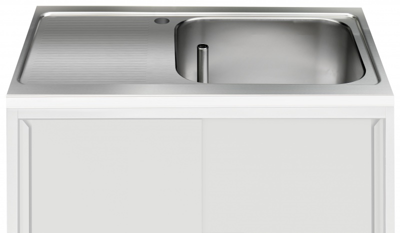 Made from 304 AISI stainless steel. The 40mm high worktop is in 304 AISI stainless steel. Heavy duty splashback is 100mm high with a 45° top angle with welded sides and rear part covered by stainless steel profile. Bowl fully welded and with polished corners.Bowl mm600x500x250h with overflow pipe and 70Ø drain hole; left hand drainer.