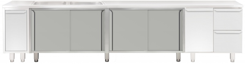 Constructed entirely in 304 AISI stainless steel. Front and rear longitudinal stainless steel c-channel reinforcement. Easily removable sliding doors with sound deadening internal and external panels have stainless steel bearings on the top and a hidden runner on the bottom. 150mm height-adjustable (0/+90mm) oversized feet (65x65mm) can be removed for masonry installation. 45° degree internal side corner junction system.