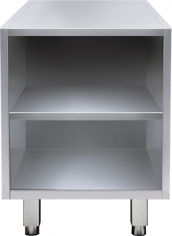Constructed entirely in 304 AISI stainless steel. Front and rear longitudinal stainless steel c-channel reinforcement. Internal and external side panels with sound deadening reinforcements to strengthen structure. 150mm height-adjustable (0/+90mm) oversized feet (65x65mm) can be removed for masonry installation. 45° degree internal side corner junction system. 304 AISI middle shelf, with inner double fold to eliminate gaps between sides and back, height-adjustable in 3 positions with a stainless steel support to avoid twisting.