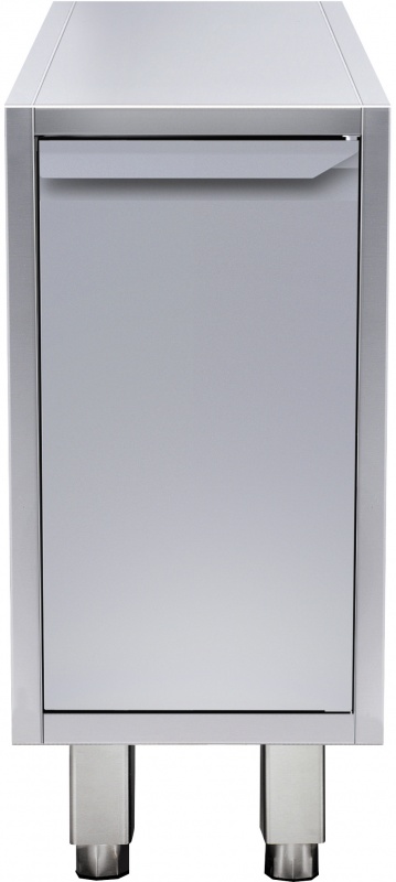 Constructed entirely in 304 AISI stainless steel. Front and rear longitudinal stainless steel c-channel reinforcement. Internal and external side panels with sound deadening reinforcements to strengthen structure. Door incorporates a sound deadening internal panel and is fitted with 304 AISI stainless steel hinges allowing an opening of 180° degrees. 150mm height-adjustable (0/+90mm) oversized feet (65x65mm) can be removed for masonry installation. 45° degree internal side corner junction system. 304 AISI middle shelf, with inner double fold to eliminate gaps between sides and back, height-adjustable in 3 positions with a stainless steel support to avoid twisting.