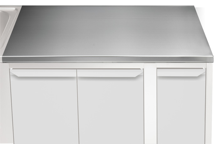 The 40mm high worktop in 304 AISI stainless steel, incorporates an 18mm under panel made of sound deadening material. Front and rear longitudinal stainless steel c-channel reinforcement. Special shaped front and rear profiles, without burrs, to avoid water leakage. Fully welded and shapely polished corners. Work tops can be mounted on brackets, legs or bases in order to obtain a work height of 900mm.