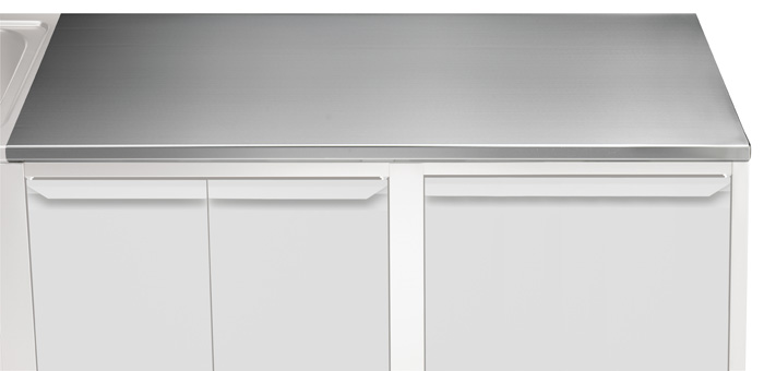 The 40mm high worktop in 304 AISI stainless steel, incorporates an 18mm under panel made of sound deadening material. Front and rear longitudinal stainless steel c-channel reinforcement. Special shaped front and rear profiles, without burrs, to avoid water leakage. Fully welded and shapely polished corners. Work tops can be mounted on brackets, legs or bases in order to obtain a work height of 900mm.