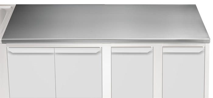 The 40mm high worktop in 304 AISI stainless steel, incorporates an 18mm under panel made of sound deadening material. Front and rear longitudinal stainless steel c-channel reinforcement. Special shaped front and rear profiles, without burrs, to avoid water leakage. Fully welded and shapely polished corners. Work tops can be mounted on brackets, legs or bases in order to obtain a work height of 900mm.