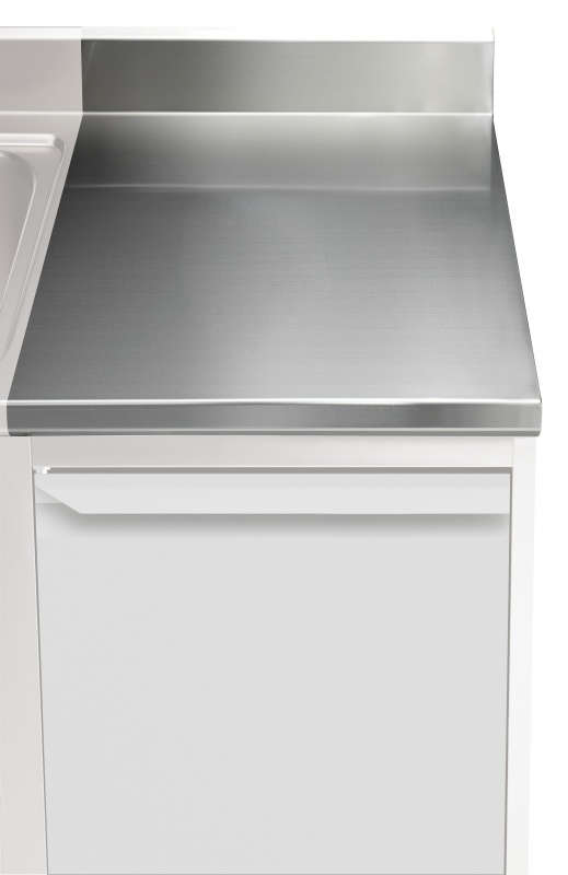 The 40mm high worktop in 304 AISI stainless steel, incorporates an 18mm under panel made of sound deadening material. Front and rear longitudinal stainless steel c-channel reinforcement. Special shaped front profile, without burrs, to avoid water leakage. Fully welded and shapely polished corners. 100mm boxed heavy duty splash back with a 45° top angle and fully welded sides. Work tops can be mounted on brackets, legs or bases in order to obtain a work height of 900mm.