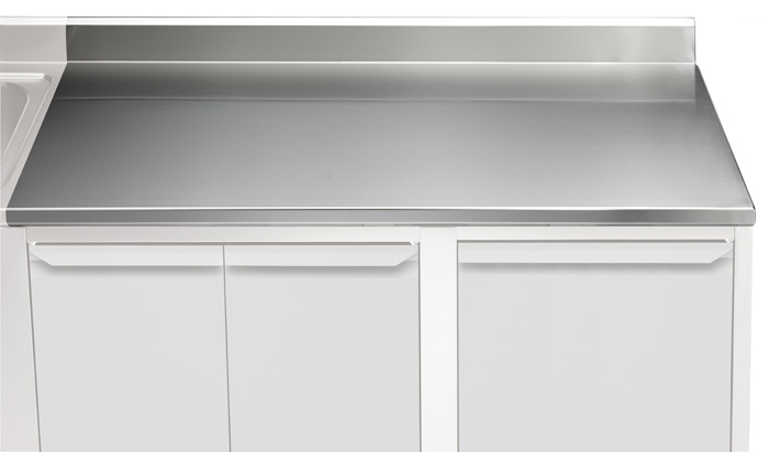 The 40mm high worktop in 304 AISI stainless steel, incorporates an 18mm under panel made of sound deadening material. Front and rear longitudinal stainless steel c-channel reinforcement. Special shaped front profile, without burrs, to avoid water leakage. Fully welded and shapely polished corners. 100mm boxed heavy duty splash back with a 45° top angle and fully welded sides. Work tops can be mounted on brackets, legs or bases in order to obtain a work height of 900mm.