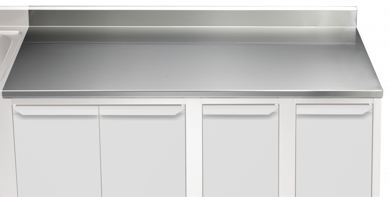 The 40mm high worktop in 304 AISI stainless steel, incorporates an 18mm under panel made of sound deadening material. Front and rear longitudinal stainless steel c-channel reinforcement. Special shaped front profile, without burrs, to avoid water leakage. Fully welded and shapely polished corners. 100mm boxed heavy duty splash back with a 45° top angle and fully welded sides. Work tops can be mounted on brackets, legs or bases in order to obtain a work height of 900mm.