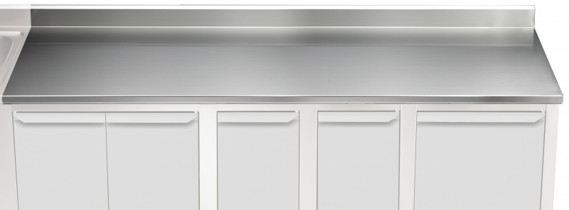 The 40mm high worktop in 304 AISI stainless steel, incorporates an 18mm under panel made of sound deadening material. Front and rear longitudinal stainless steel c-channel reinforcement. Special shaped front profile, without burrs, to avoid water leakage. Fully welded and shapely polished corners. 100mm boxed heavy duty splash back with a 45° top angle and fully welded sides. Work tops can be mounted on brackets, legs or bases in order to obtain a work height of 900mm.