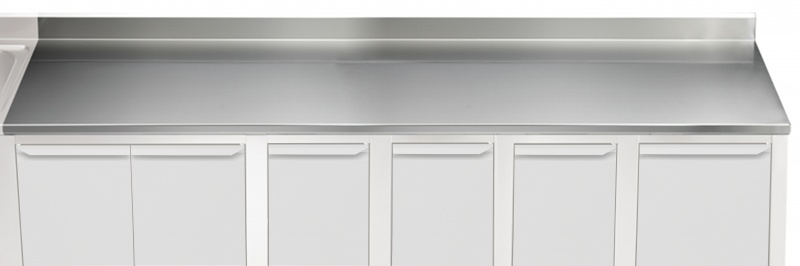 The 40mm high worktop in 304 AISI stainless steel, incorporates an 18mm under panel made of sound deadening material. Front and rear longitudinal stainless steel c-channel reinforcement. Special shaped front profile, without burrs, to avoid water leakage. Fully welded and shapely polished corners. 100mm boxed heavy duty splash back with a 45° top angle and fully welded sides. Work tops can be mounted on brackets, legs or bases in order to obtain a work height of 900mm.