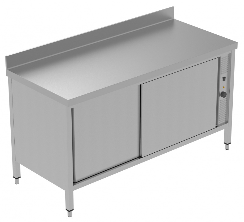 Enhanced stability and solid construction thanks to the welded frame and legs and ventilated hot air flow system guarantees temperature eveness. Model specific to keep dishes warm. Can reach a maximum temperature of 70° in 45 minutes. The 50mm high worktop in 304 AISI stainless steel, with Scotch Brite finishing 15/10 mm in thickness, has anti-drip edges and welded corners. 18mm thick undertop waterproof reinforcement, it's completely waterproof, double-sided laminated and 100% recyclable. Sound-deadned double walled sliding doors on roll bearings with end limit stop (7/10 in thickness in 304 AISI stainless steel). Upstand h=100mm with 10mm radius corner covered on the back with AISI 304 stainless steel spot welded profile. Equipped with 40mm high hot intermediate shelf (8/10 in thickness) in 304 AISI stainless steel with upturned edges and AISI 304 bar reinforcement. Base panel in AISI 304 stainless steel (8/10 in thickness) with upturned edges reinforced by stainless steel AISI 304 bars. Welded to the legs for further structure reinforcement. Height adjustable feet (-20/+30 mm) in 304 AISI stainless steel.