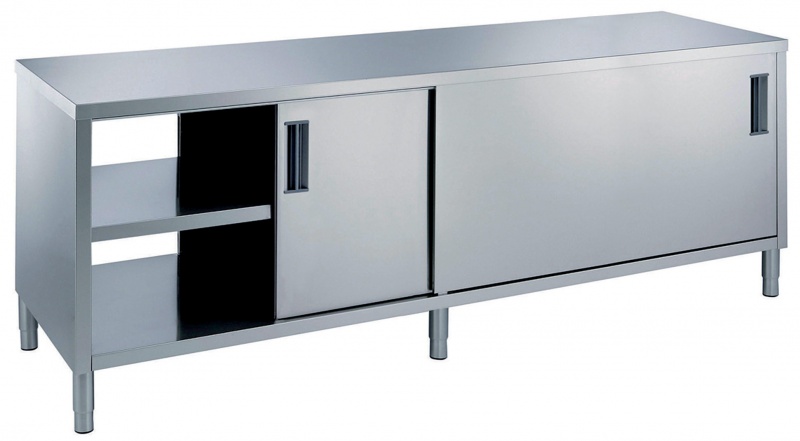 The 50mm high worktop in 304 AISI stainless steel, 1,5mm in thickness, is sound-deadened and has anti-drip edges and welded corners. Inner welded frame in stainless steel. Under-top reinforcement in 304 AISI st/st. Intermediate reinforced shelf in 304 AISI st/st that can be positioned at three different heights. Base shelf in 304 AISI st/st, 1mm in thickness, reinforced by 1,5mm support bars in AISI 304 st/st. Four sound-deadened sliding doors in 304 AISI st/st on both sides. Welded construction for maximum strength. Six 2''-feet in 304 AISI stainless steel, h=200mm, adjustable in height (-50+20mm).