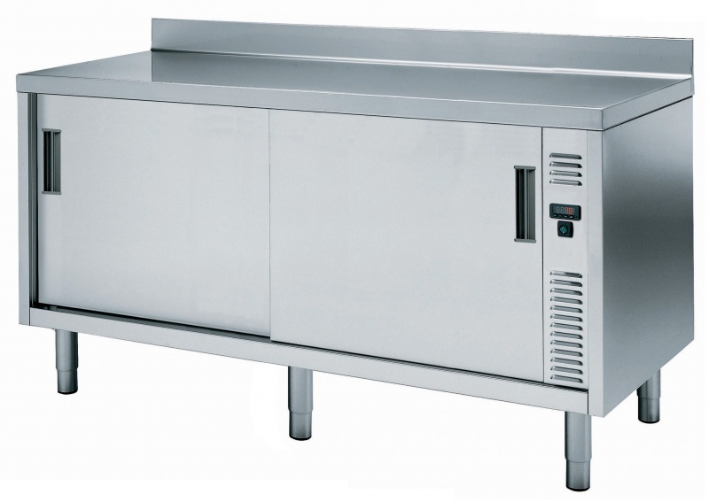 The 50mm high worktop in 304 AISI stainless steel, 1,5mm in thickness, is sound-deadened and has anti-drip edges and welded corners. Inner welded frame in stainless steel. Under-top reinforcement in 304 AISI st/st. Integral rear upstand, h=100mm, with 10mm radius. Intermediate reinforced shelf in 304 AISI st/st that can be positioned at three different heights. Base shelf in 304 AISI st/st, 1mm in thickness, reinforced by 1,5mm support bars in AISI 304 st/st. Two sound-deadened sliding doors in 304 AISI st/st. Welded construction for maximum strength.Ventilated hot air flow system guarantees temperature evenness, air flows underneath the intermediate shelf and throughout the cabinet. Thermostat with digital display to adjust the internal temperature (up to 75°C). Six 2''-feet in 304 AISI stainless steel, h=200mm, adjustable in height (-50+20mm).
