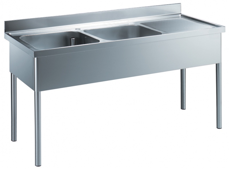 The 50mm high worktop in 304 AISI stainless steel, 1,2mm in thickness, is sound-deadened and has an overflow rim and welded corners. Integral rear upstand, h=100mm, with 10mm radius. All-round apron panelling in 304 AISI st/st.Round section legs and feet in 304 AISI stainless steel, 50mm in diameter. Height-adjustable feet (+0-50mm).Single-pressed, sound-deadened bowls mm 500x500x300h with overflow pipe and drain hole (2''). Right hand drainer inclined towards the bowl.