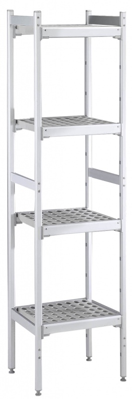 For linear installation. 4-level shelving set with louvered sectional polyethylene shelves (depth=373mm). Aluminium (20 micron) side uprights (height=1700mm). Adjustable feet.