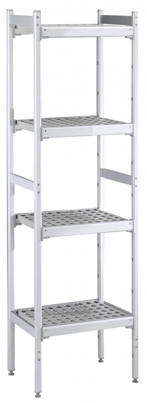 For linear installation. 4-level shelving set with louvered sectional polyethylene shelves (depth=373mm). Aluminium (20 micron) side uprights (height=1700mm). Adjustable feet.
