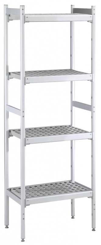 For linear installation. 4-level shelving set with louvered sectional polyethylene shelves (depth=373mm). Aluminium (20 micron) side uprights (height=1700mm). Adjustable feet.