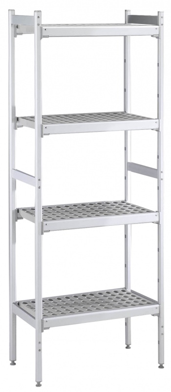 For linear installation. 4-level shelving set with louvered sectional polyethylene shelves (depth=373mm). Aluminium (20 micron) side uprights (height=1700mm). Adjustable feet.