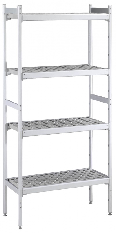 For linear installation. 4-level shelving set with louvered sectional polyethylene shelves (depth=373mm). Aluminium (20 micron) side uprights (height=1700mm). Adjustable feet.