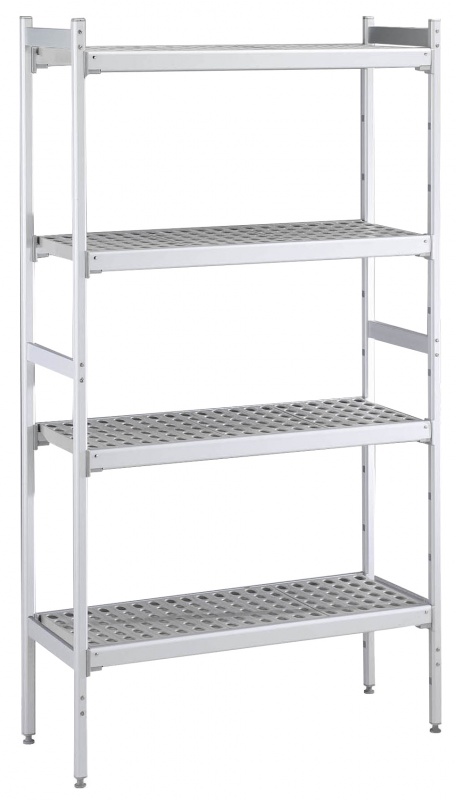 For linear installation. 4-level shelving set with louvered sectional polyethylene shelves (depth=373mm). Aluminium (20 micron) side uprights (height=1700mm). Adjustable feet.For linear installation. 4-level shelving set with louvered sectional polyethylene shelves (depth=373mm). Aluminium (20 micron) side uprights (height=1700mm). Adjustable feet.