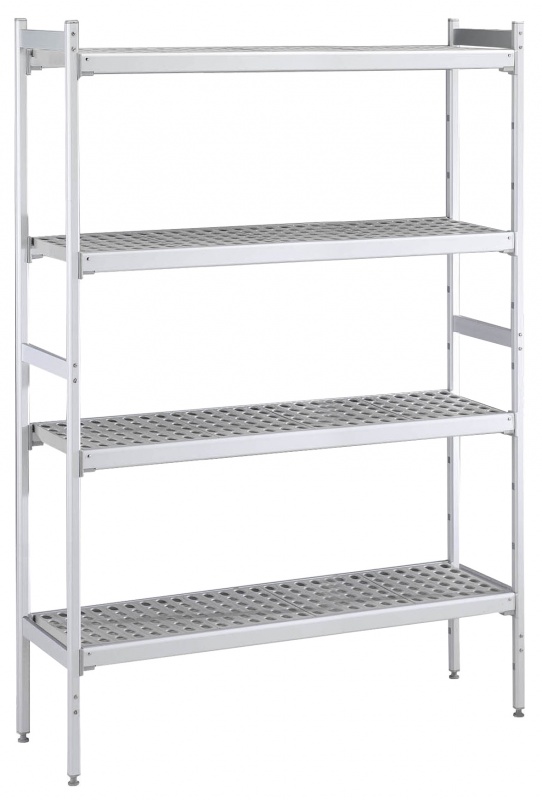 For linear installation. 4-level shelving set with louvered sectional polyethylene shelves (depth=373mm). Aluminium (20 micron) side uprights (height=1700mm). Adjustable feet.