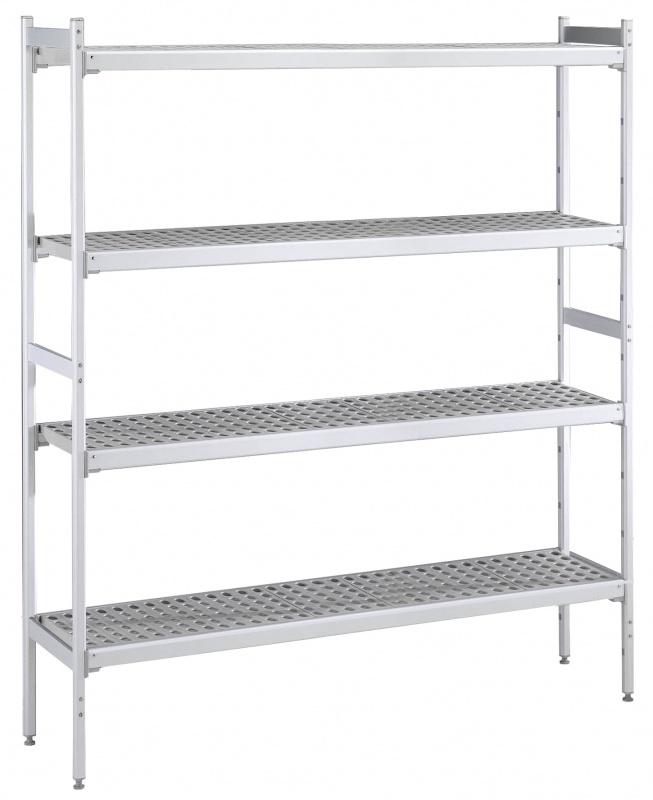 For linear installation. 4-level shelving set with louvered sectional polyethylene shelves (depth=373mm). Aluminium (20 micron) side uprights (height=1700mm). Adjustable feet.