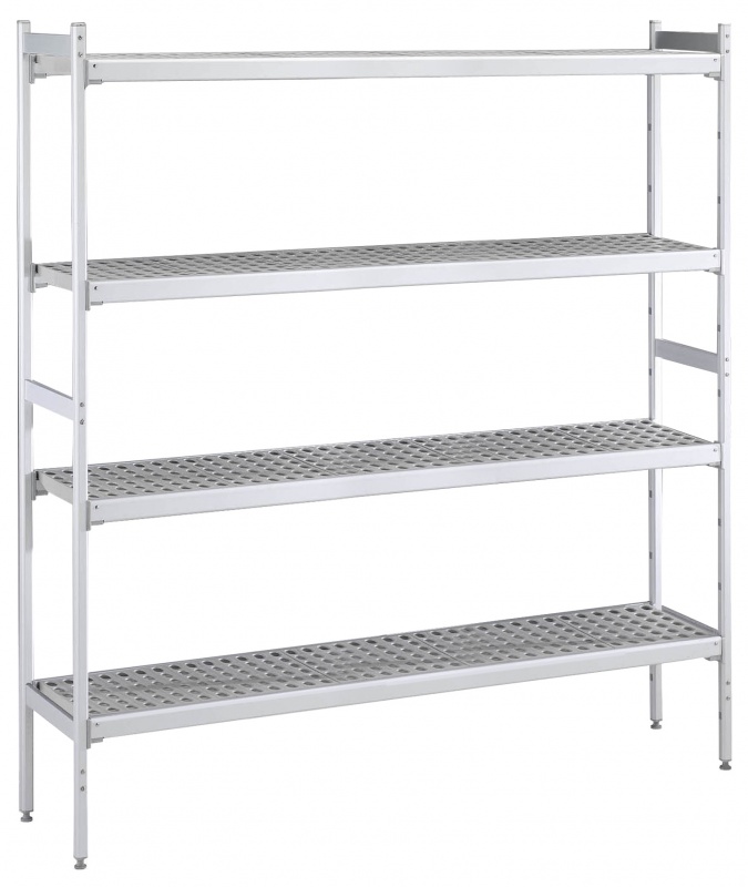 For linear installation. 4-level shelving set with louvered sectional polyethylene shelves (depth=373mm). Aluminium (20 micron) side uprights (height=1700mm). Adjustable feet.