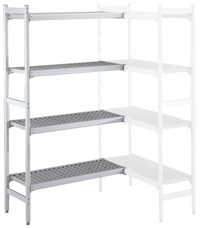 For corner installation. 4-level shelving set with louvered sectional polyethylene shelves (depth=475mm). Aluminium (20 micron) side uprights (height=1700mm). Adjustable feet. To be combined with a linear shelving unit