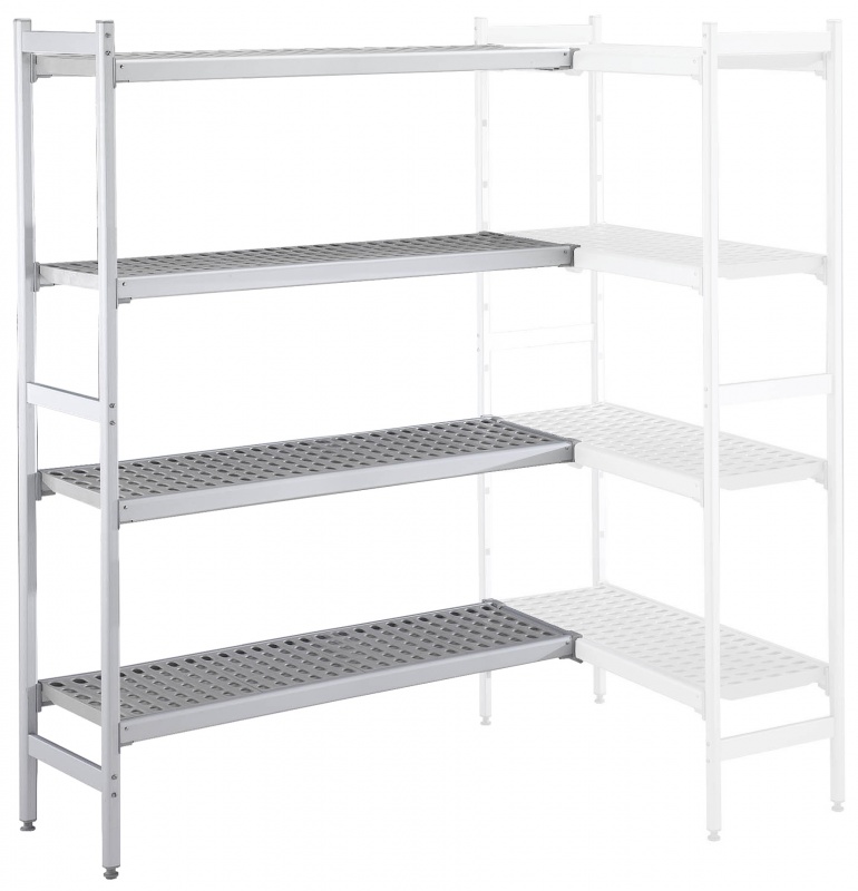 For corner installation. 4-level shelving set with louvered sectional polyethylene shelves (depth=475mm). Aluminium (20 micron) side uprights (height=1700mm). Adjustable feet. To be combined with a linear shelving unit