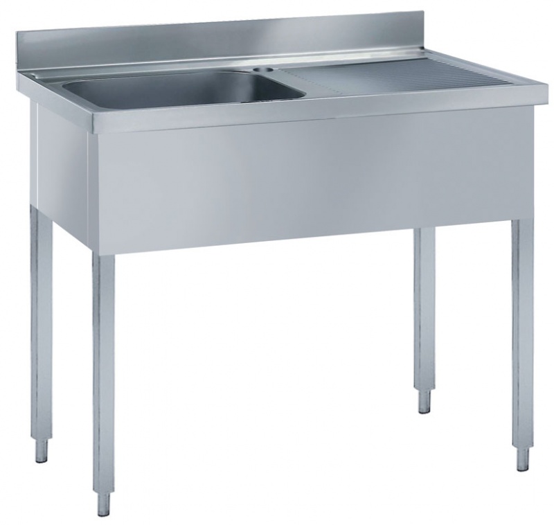 Made from 304 AISI stainless steel. The 50mm high worktop in 304 AISI stainless steel, 1mm in thickness, is sound-deadened and has an overflow rim and welded corners. Integral rear upstand, h=100mm, with 8mm radius. All-round apron. Square section legs 40x40mm on 1'' height-adjustable feet (+/-20mm)Bowl mm600x500x300h with overflow pipe and 2''drain hole; right hand drainer.