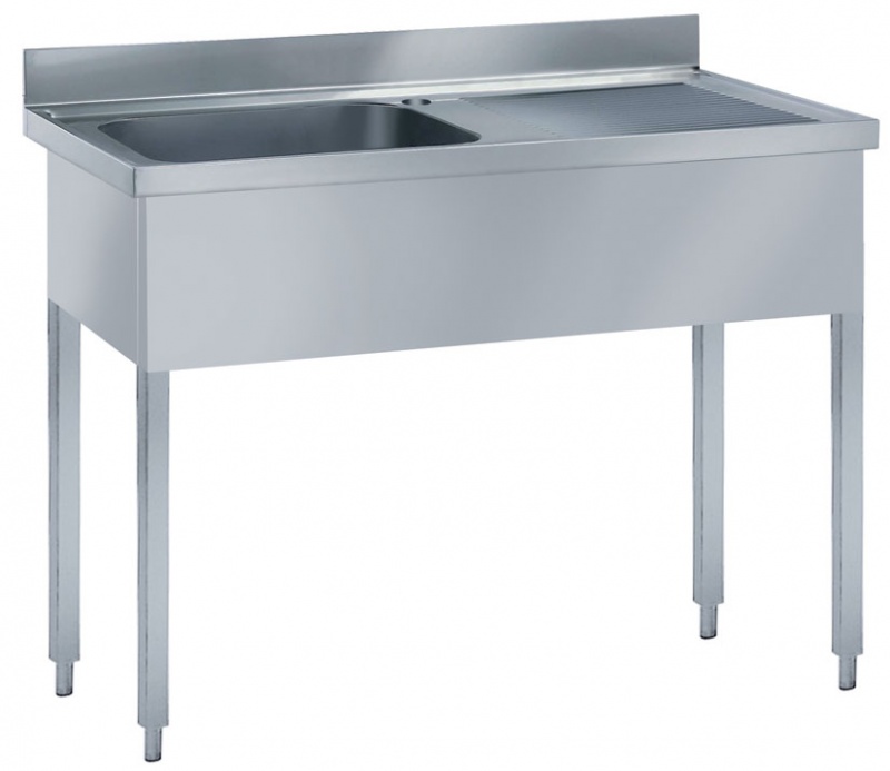 Made from 304 AISI stainless steel. The 50mm high worktop in 304 AISI stainless steel, 1mm in thickness, is sound-deadened and has an overflow rim and welded corners. Integral rear upstand, h=100mm, with 8mm radius. All-round apron. Square section legs 40x40mm on 1'' height-adjustable feet (+/-20mm)Bowl mm600x500x300h with overflow pipe and 2''drain hole; right hand drainer.